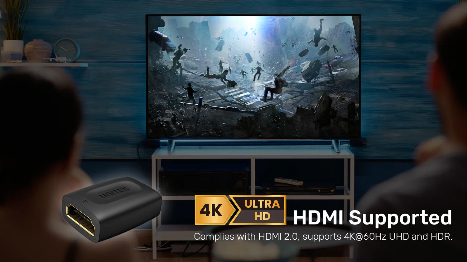 The 4K HDMI Coupler supports HDMI 2.0, enabling 4K@60Hz UHD and HDR content for an enhanced viewing experience. Its wide compatibility allows for seamless connections between various devices, including TV Boxes, TV Sticks, Game Consoles, PCs, Laptops, and displays like HDTVs, Monitors, and Projectors. This versatility makes it an essential accessory for high-definition setups.