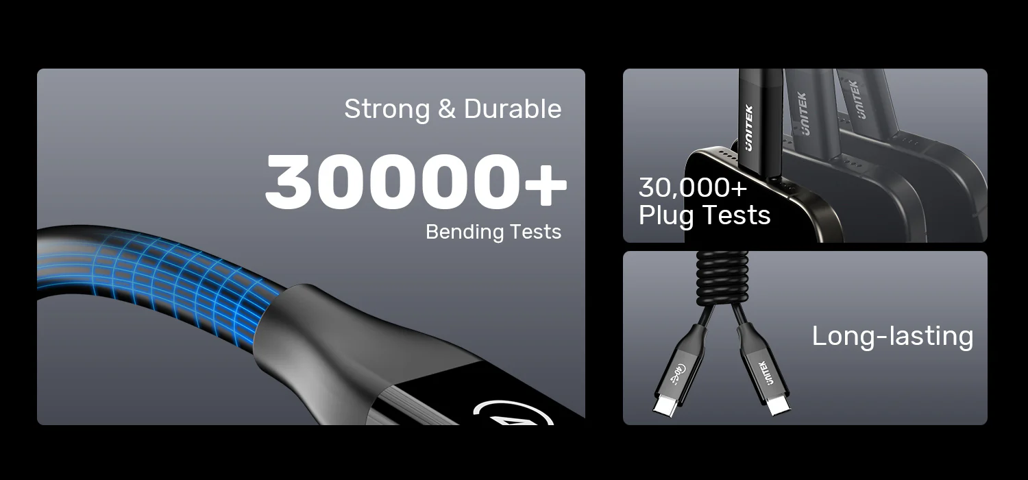 UNITEK USB4 USB-C Cable supports USB-C Power Delivery at a maximum of 240W (48V/5A). Charge both high-consumption laptops and compact smartphones using the same cable and a PD power adapter, thanks to programmable smart auto-detection. (Note: Charging speed may depend on the host device’s capability