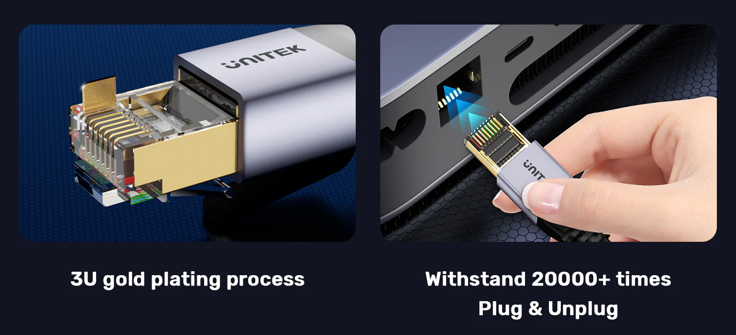 The UNITEK Cat 8 Ethernet Cable features advanced design with 4 shielded foiled twisted pairs (S/FTP) and an aluminum foil shielding layer. This innovative construction significantly reduces interference and crosstalk, ensuring a lightning-fast and stable connection for all your online activities. Whether you’re gaming, streaming, or working from home, enjoy a seamless experience with minimal lag and maximum reliability. Upgrade your network performance with UNITEK!