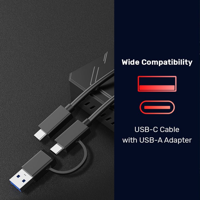 Features both USB-A and USB-C interfaces with an included USB-C to USB-A/C cable for maximum connectivity.