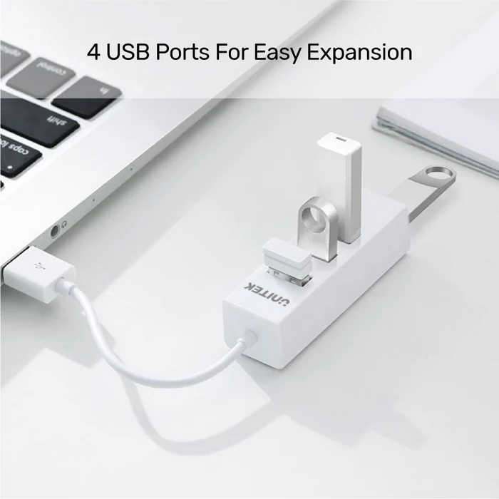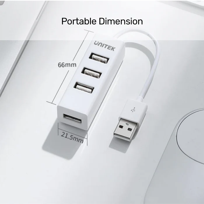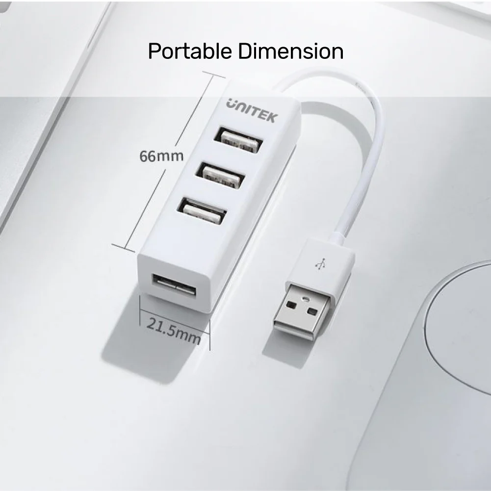UNITEK 4-Port USB 2.0 Hub offers a portable design—just 66mm x 21.5mm—making it easy to add four USB ports to your laptop or desktop. Enjoy fast 480Mbps data transfer, plug-and-play convenience, and reliable connectivity for all your USB devices—ideal for travel, home, or office use.