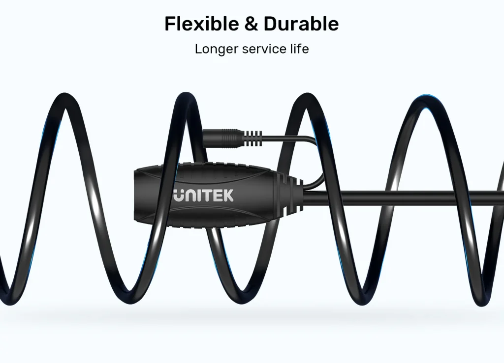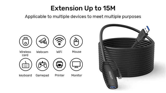 The UNITEK USB 5Gbps Extension Cable reaches up to 15 meters, supporting a 5Gbps transfer rate for devices like mice, printers, and gamepads, thanks to built-in signal boosters. It ensures stable, long-distance connections with a DC 5.0V/2.0A power port for downstream devices, making it ideal for flexible setups in home offices, gaming, or surveillance systems.