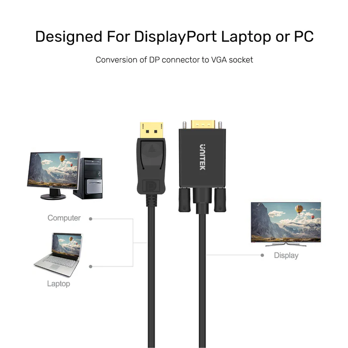 Unitek DisplayPort to VGA Male Cable for connecting DisplayPort devices to VGA displays.